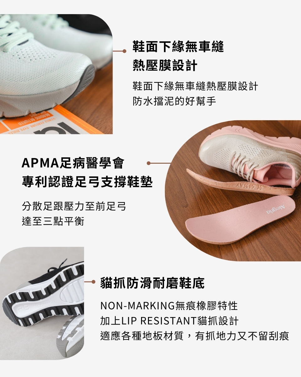 - 鞋面下緣無車縫熱壓膜設計,防水擋泥的好幫手