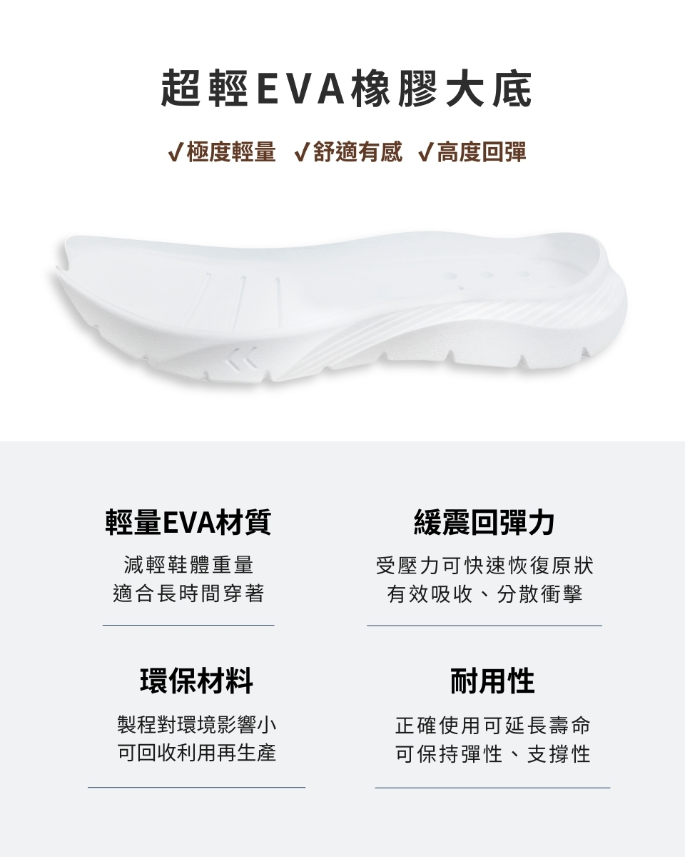 - EVA輕量化設計,提供優異的緩衝、吸震和舒適性